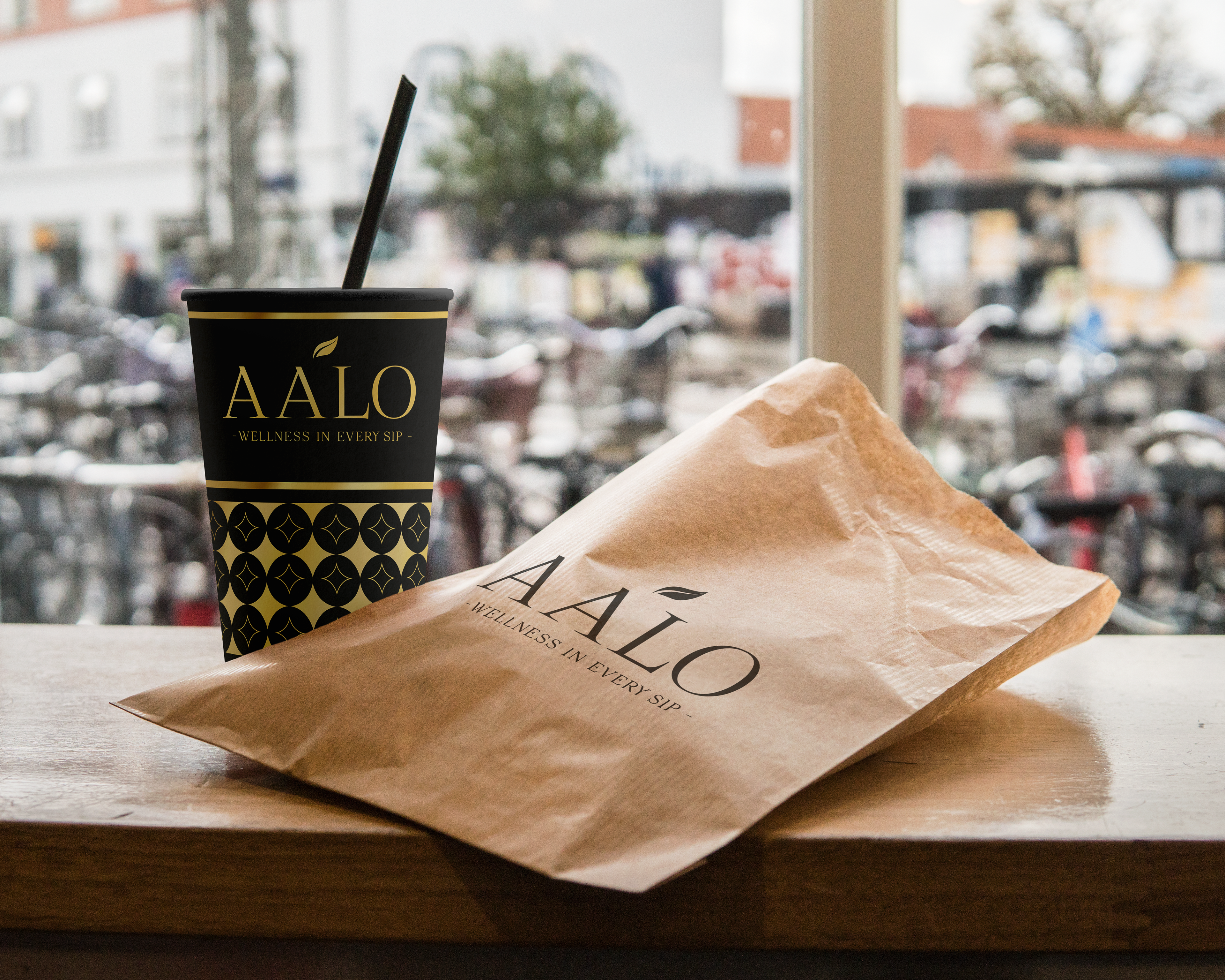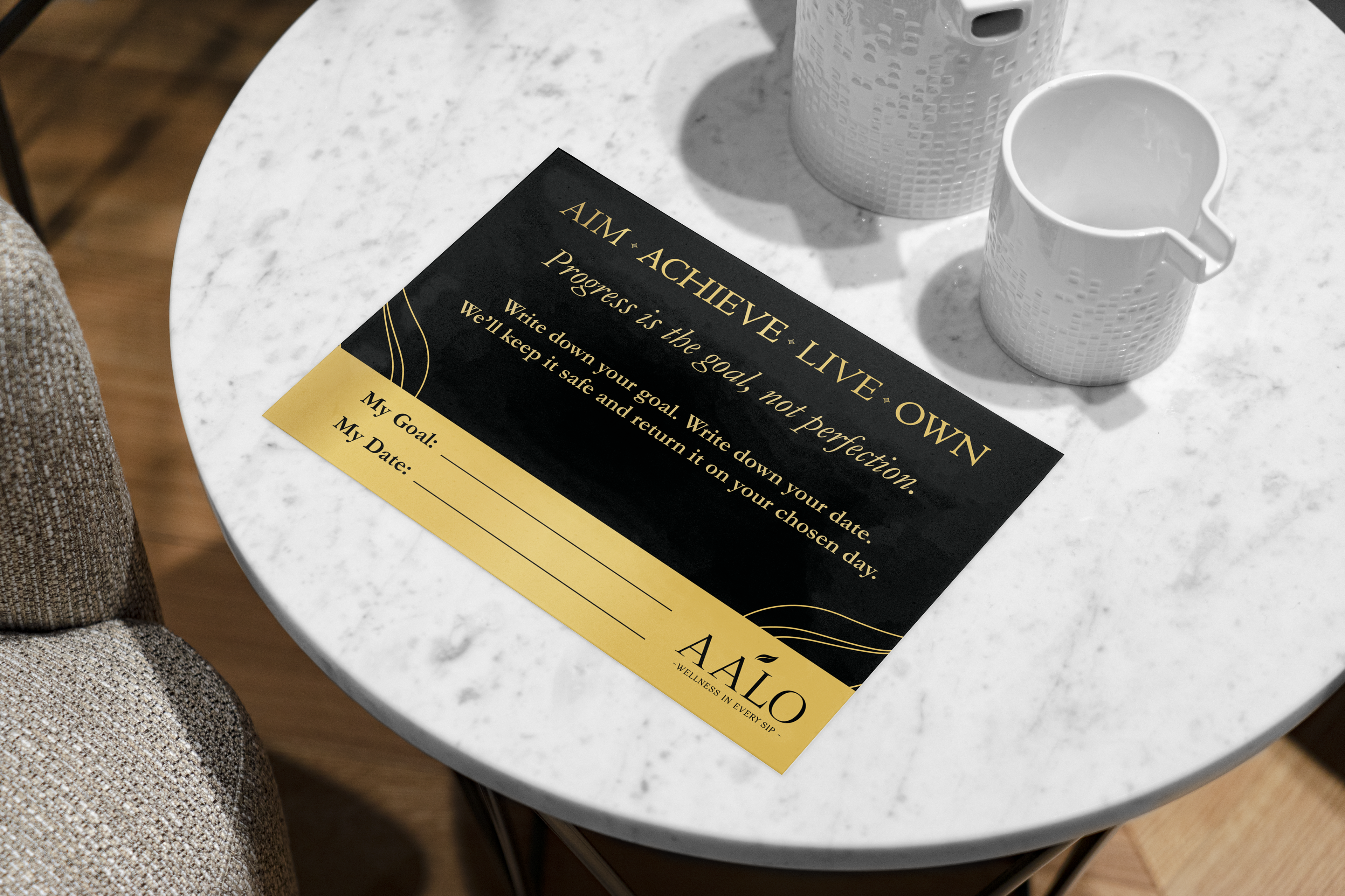 The creation process for this logo mark followed the direction of the owners closely, with the final approved logo type being reminiscent of Middle-Eastern branding with the gold colours and gradients, and brand pattern. After completing the logo, follow up designs were created for an introductory nutrition goal postcard, as well as designs for some of the café packaging.