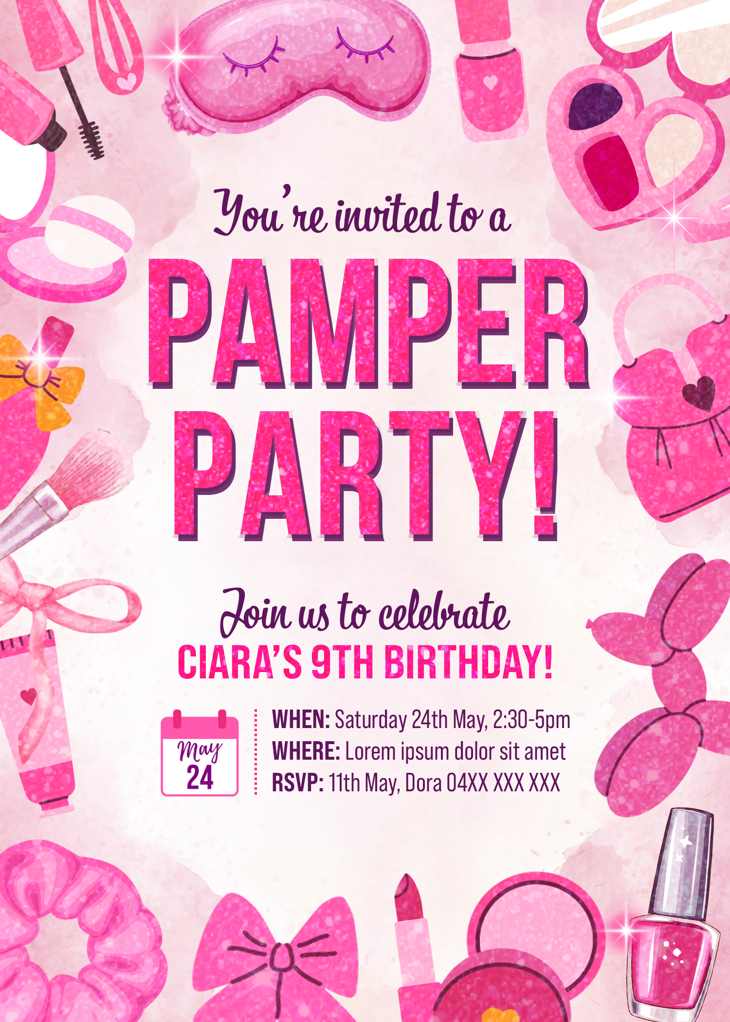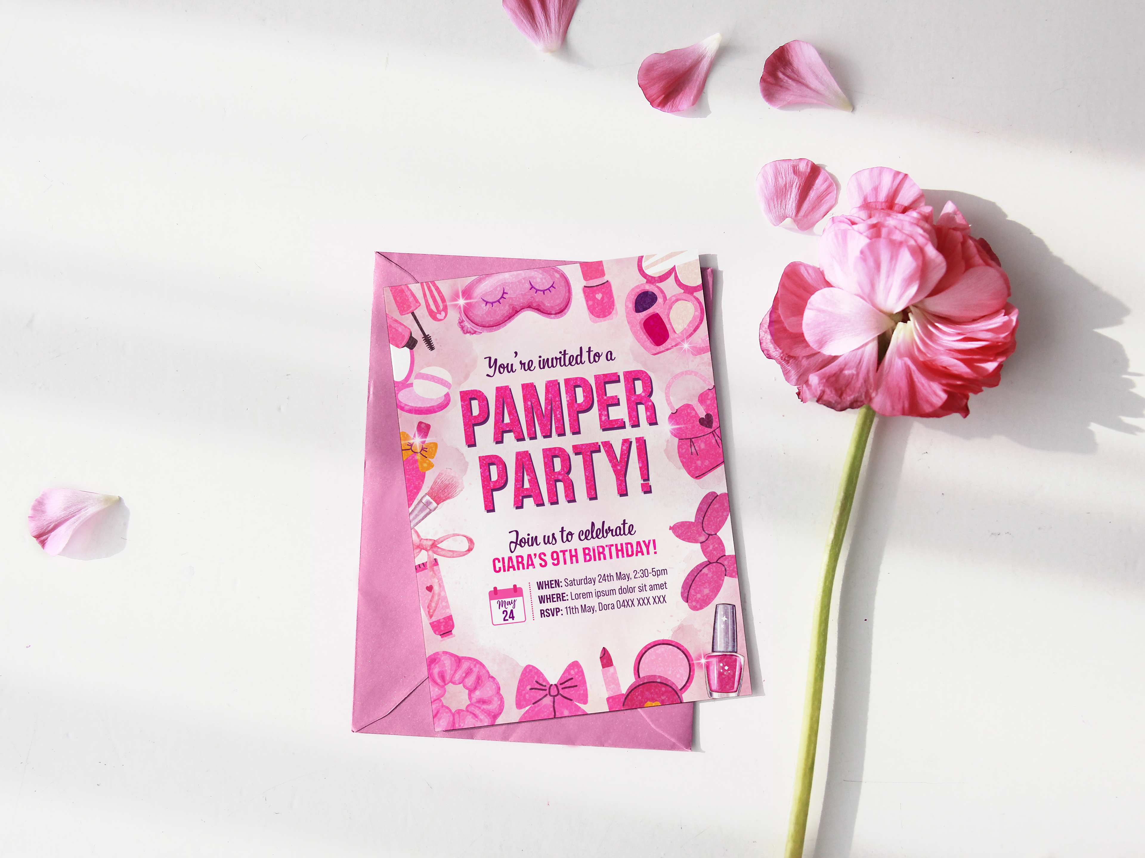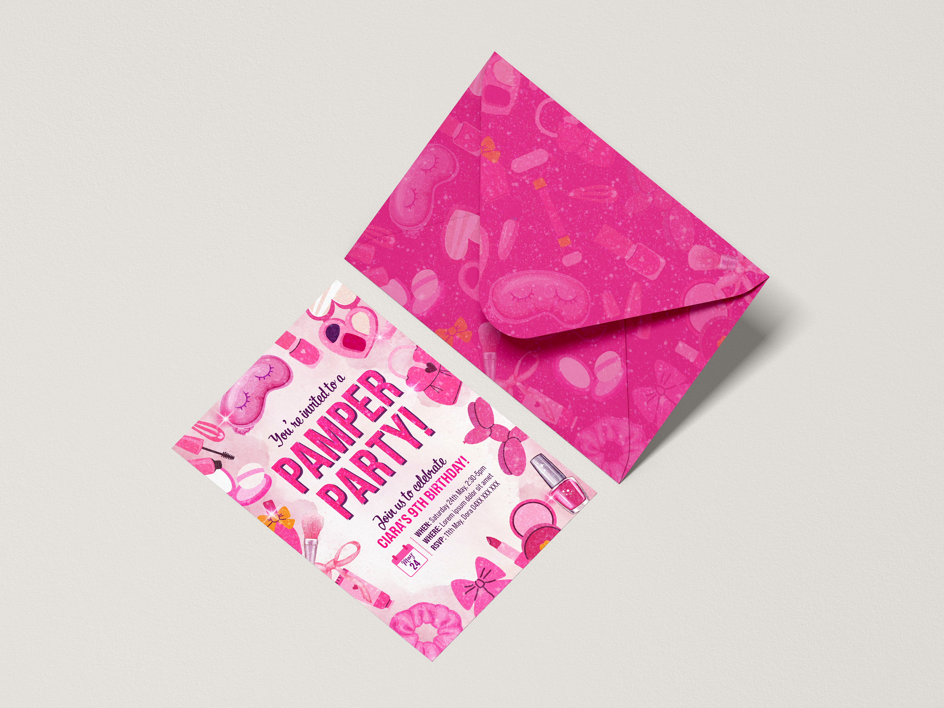 These two designs are party invitations created for a colleague's daughter. For both invitations, I was given creative freedom to make something that fit the themes of the 9-year-old's events, with the invitation being distributed to families and friends. Particularly with the "Pamper Party" invitation, I wanted to make something that felt girly, sparkly and fun for a child, and make a design that the child would feel excited about handing out to her friends and putting on her fridge.