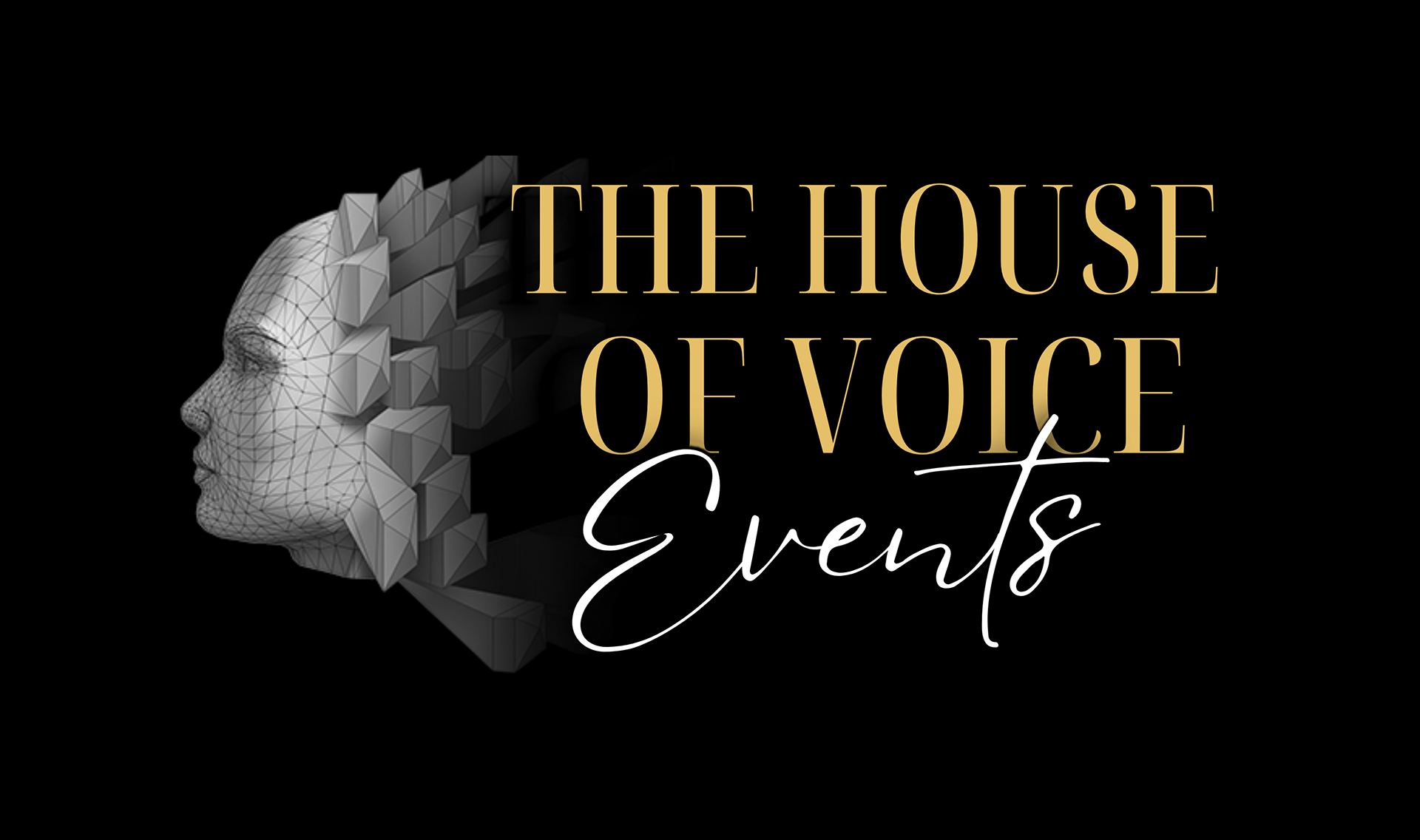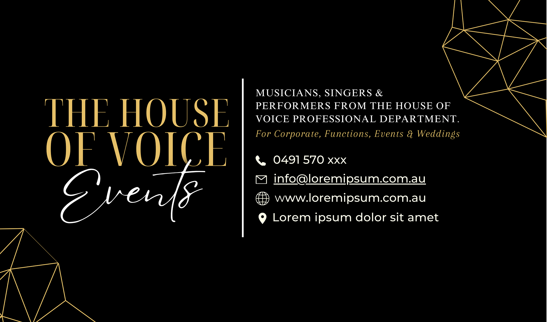 A business card event for an established music school business, The House of Voice, who are advertising a performer events booking service. The owner requested for the card to use the brand's established brand mark (the grey side profile), with a colour palette of gold and black to look sleek, professional and elegant.